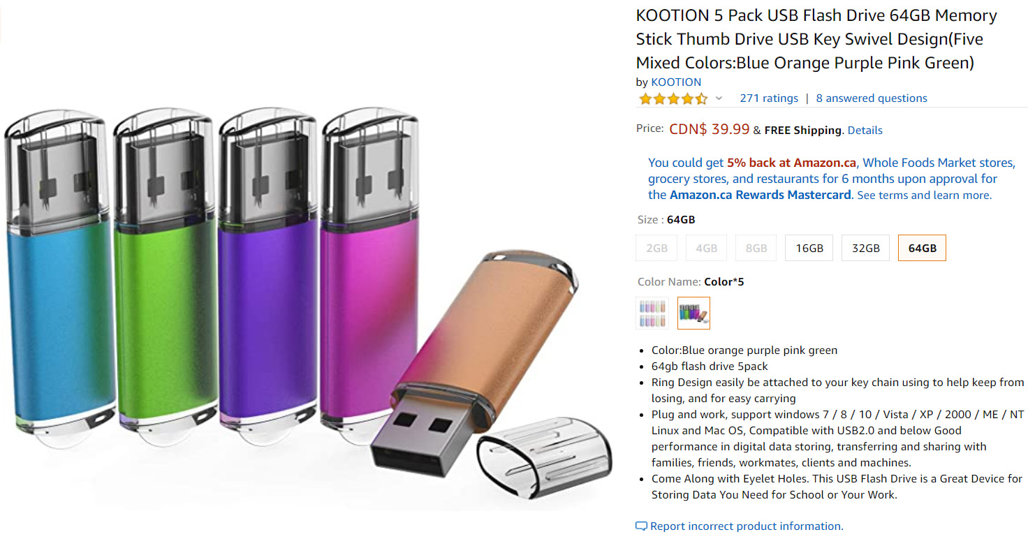 990 5 pk 64 GB flash drives 15 hrs per